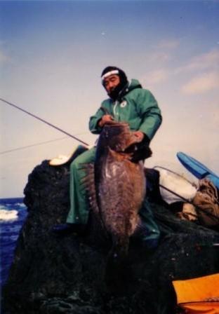 | クエは荒磯の帝王、磯釣りの最大のターゲットだ。 関東ではモロコ、九州ではアラと呼ばれ、ハタ科に属する。 種類も多く、私が磯で狙うのは大型のクエ(20〜50キロ)。 伊豆七島、伊豆半島、四国、九州、南西諸島、男女群島でも釣れる。 奄美あたりまで南下すれば、斑点が特徴のヤイトハタ(20〜80`) ミクロネシア、オーストラリアでは野球ボール大の斑点が特徴のカスリハタ(30〜150`)。 サメをも襲い、人喰いハタと恐れられるタマカイは100〜400`と超巨大である。 |