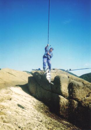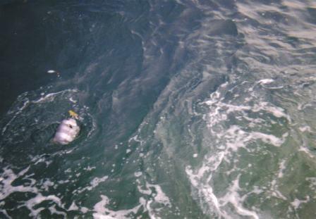 |  |  平成11年6月15日 金床にて ドンビ向き65bのポイントでイシダイをかける 水面に浮かせ、ハリがかりを確認の後、抜き上げる |