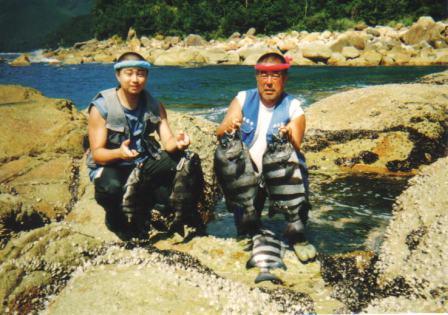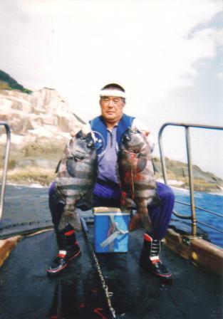 | 平成10年7月29日 金床にて イシダイ62aを仕留めたオヤジ | 平成12年8月27日 金床 中部磯友会/服部芳明 イシダイ50a・48aの2枚 オヤジはマンジュウで63a・60a・45aの3枚 |