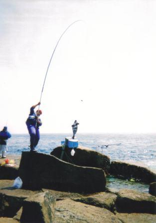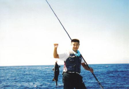 | 平成9年8月30日 ナガシマにて 水面に浮いたイシダイを気合いもろとも抜き上げる | |