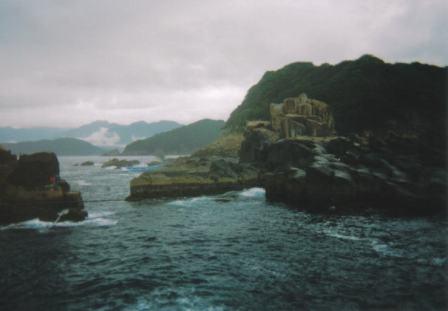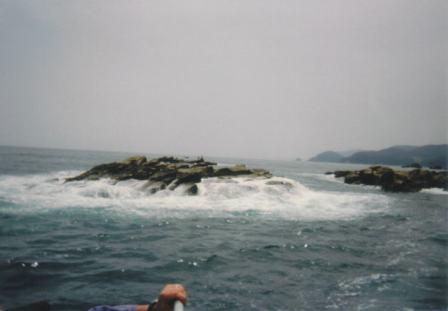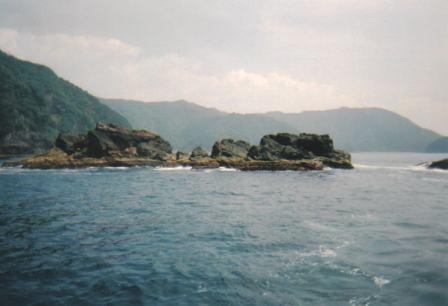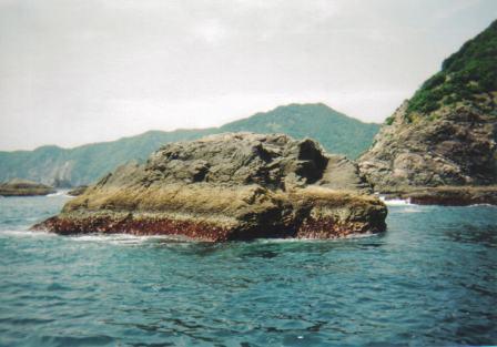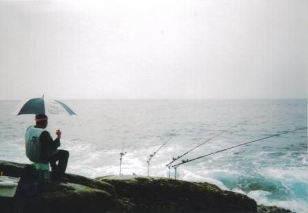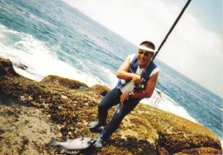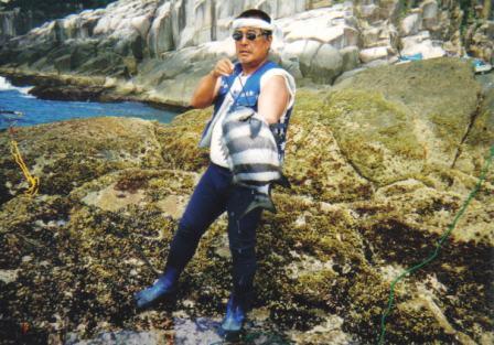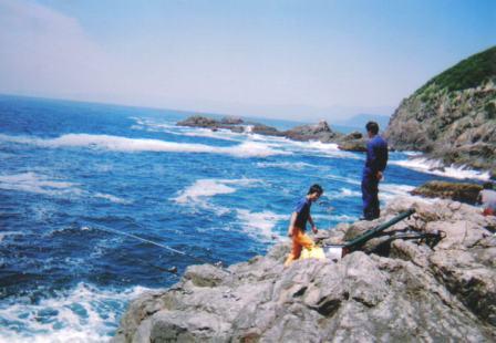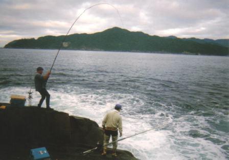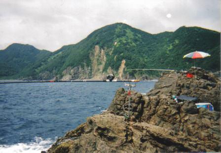 | 一番左の磯が沖大黒のダンゾ向きポイント | 平成17年7月3日 沖大黒ダンゾ向きポイントにて 全磯連中部支部懇親大会で優勝したオヤジ 60a・3.9`の銀ワサはダンゾ向き60b沖で喰ってきた 雨中の釣りだった |