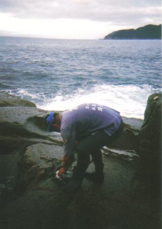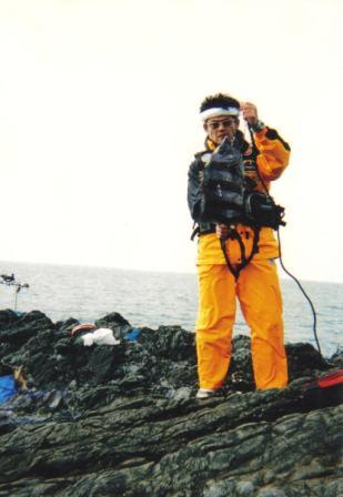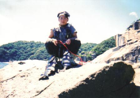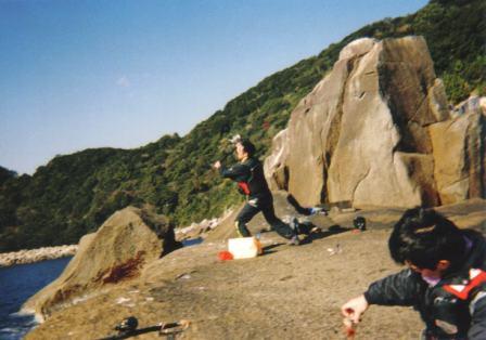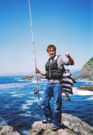 | 平成13年8月14日 ソコブにて(水温は21℃) 中部磯友会:兜森琢也/イシダイ60a 大黒からの潮が足下に当たっていた | この日は60b沖のポイントで48aを追加 エサはヤドカリを使用 |