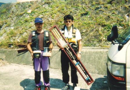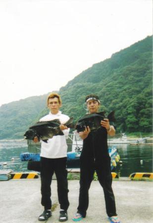 |  平成11年6月13日 金床本ポインにて 伊藤君(48a)とオヤジ(54a) 中市氏の63aを回収の船上で |  |