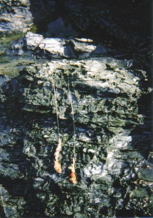 | 平成12年6月11日 長バエ先端にて 中部磯友会:高木 50b沖のポイントでイシダイ57a・3.65` | トーフ先端 沖向きポイント 60b沖のポイントでイシダイをかける エサはヤドカリ |
