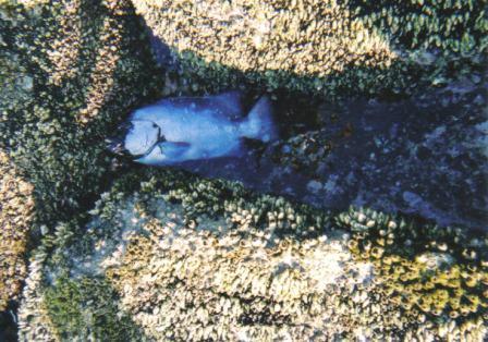 | 仕留めた銀ワサ(62a)のハリを外し、潮溜りに活かす | |