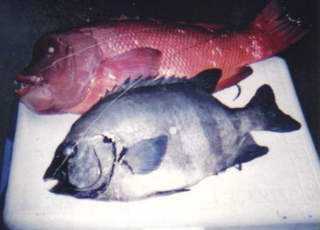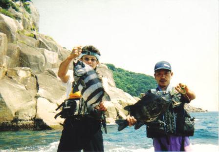 | 昭和53年5月28日 沖大黒南にて 南からの速い潮が右から左へ流れていた イシダイ70a・58a/マダイ68a(オヤジ) この日の水温は17.5℃ | 平成10年9月27日 ダンゾにて 中部列島会:山際氏/イシダイ57a・56a 同:中川氏/イシガキ40a・キジハタ4` オヤジ/イシダイ56a |