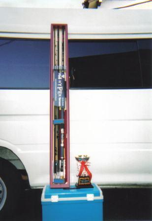 | 平成10年7月 紀伊長島 大石にて 全磯連中部春大会での優勝魚は60a 東向き60bの沈み根の際で釣る 港内から沖に向いての潮が流れていた | オヤジが優勝で手にしたトロフィーと副賞 |