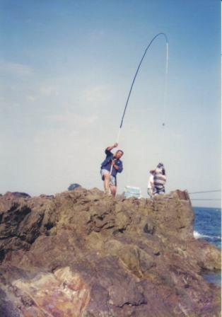 | 平成9年6月7日 ナガシマにて 南沖60bにある根の左側の海溝でアタリ 遠投仕掛でエサはヤドカリ…そして、この日はとても暑かった! | |