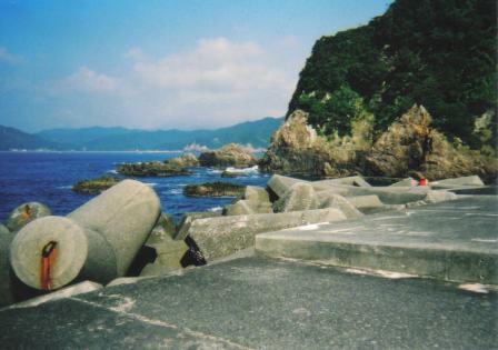 | 田曽 葛島の突堤 トーフ 右手に見えるアンパン・ケイジの磯の左手根際では 過去に70aクラスの大型イシダイも釣れている | 平成11年7月 志摩の地磯 三角石にて 仲間と二人で初めてのポイントで竿を出す 根がかりが多く苦戦し、根ずれワイヤを 長くとり、ヤドカリをエサに大物に備える 当たってきたのは69aの大物だった |