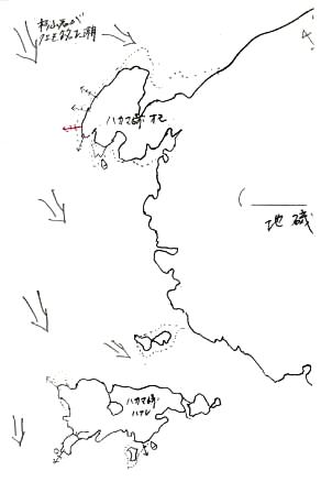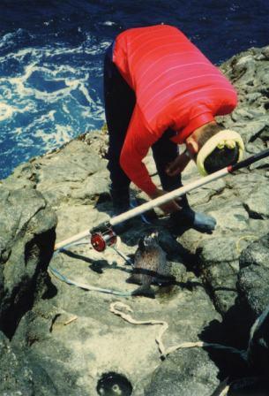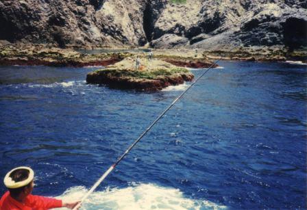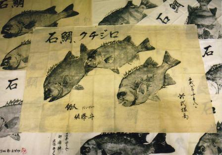 | 式根島では珍しくクチジロが釣れたので魚拓に残す | 沖のポイントを狙うときは遠投仕掛に替えて オモリをテンビンに直結 ハリスを60aと長くして底に這わせた |