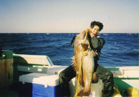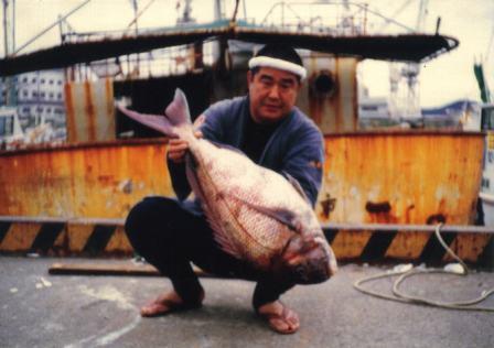 | 平成13年11月 KS石鯛クラブ 杉山知氏 ハカマ先オモで115a・24`のクエをあげる 富久丸船上にて撮影 |