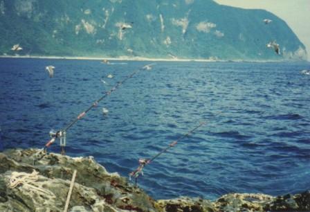 金長鼻先端 神津島の最南端にあり、潮が速く、クエ仕掛けが入らない 日が多い。 奥の船着きで竿を出す。水深は20b。 この沖、魚影は濃いが、潮が速すぎてクエ釣りは難しい。 |
