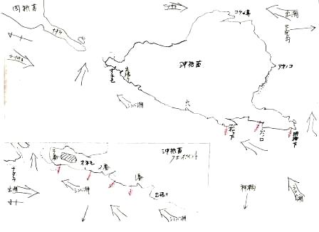 | オネモ3番の釣り場 クエポイントは足下、竿下で水深20〜25b シンバ潮が左から右に緩く流れる時がよい。 速すぎると仕掛けが入らない。 右から来る出潮はあまりよくない。 北東の風に強く、南西の風に弱い。  |