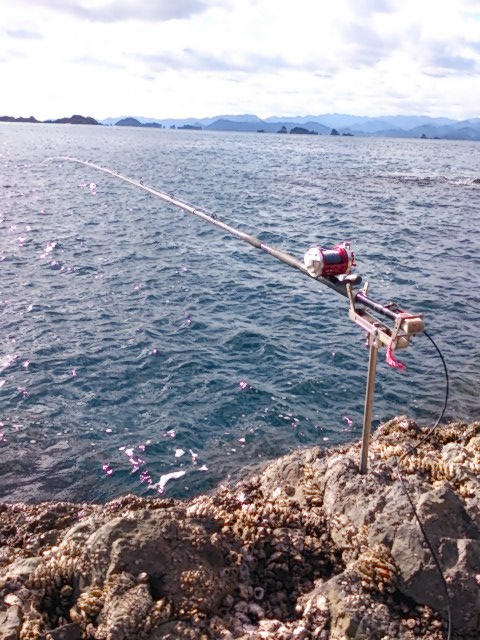 沖の大島の釣り場と竿のセッティング ![]() 75b沖のポイントで、9時半にヒット! |